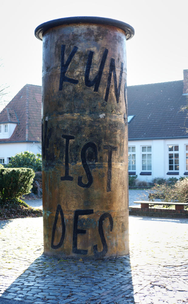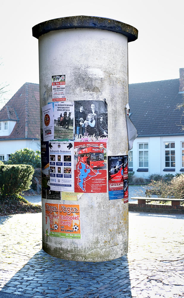 „Plagt mich ein Déjà-vu, oder fehlen mir die Sinne?“, rief der Kunstpolizist ‚Der dicke Lehmann‘ (Schmähname), als er in Neuenburg eine Textsäule erblickte, die der Texttonne am Vareler Hafen (s. Fall 12) täuschend unähnlich sah, denn hier entpuppte sich die Tonne als Litfaßsäule, camoufliert und damit entartet als Kunstwerk mit torkelnden Buchstaben. Das sofort aus Jever herbeigerufene Kunstregulierungskommando (KRK) behob in Nacht & Nebel die freche Kunstfälschung. Als unwiederbringliches Weltkulturerbe ergötzt die Skulptur „Litfaß, nach Gebrauch“ seither Dörfler und andere Umherirrende.