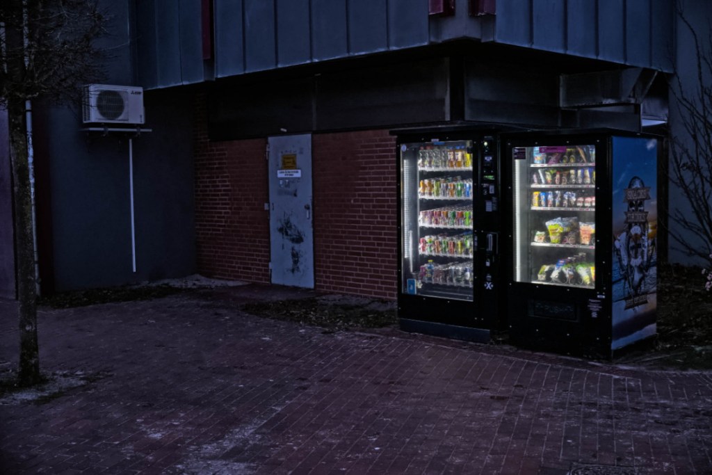 Zum Stil passend wurde für hungrige Nachtgänger und Schnellverköstigende eine Art Notrestaurant an den Klotz angefügt mit dem Nötigsten zum Überleben an der harschen Ostseeküste: Dosendrinks und Eier.