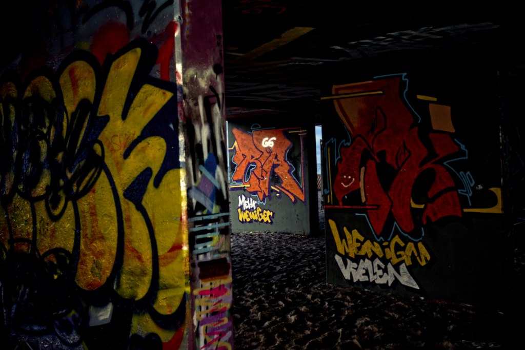 Wie schon erwähnt, erblickt man vom Strand aus auch unweigerlich das Ehrenmal, doch ach, wer sich abwendet, um noch hübschere Urlaubsansichten zu erhaschen und zu knipsen für die Lieben daheim, sollte sich mental wappnen: Ein bunkerartiger brutalistischer Klotz versperrt Sicht und frohgemutes Ansinnen. Angeblich ein aufgelassenes Schwimmbad, großzügig überlassen für Graffitikunst und Gruselfaktor.